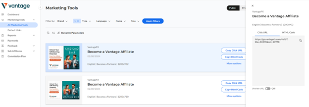 Here, you can download banners, text links, and other promotional materials. Each asset comes with a unique tracking link to ensure proper attribution and accurate reporting.