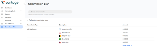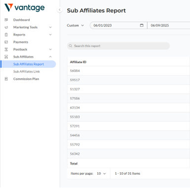 If you refer other affiliates to the Vantage program, this section shows their performance and contribution to your sub-affiliate earnings.