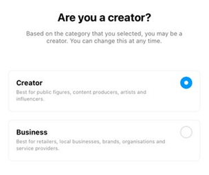 - Wählen Sie “zu einem professionellen Konto wechseln” und wählen Sie “Creator” aus